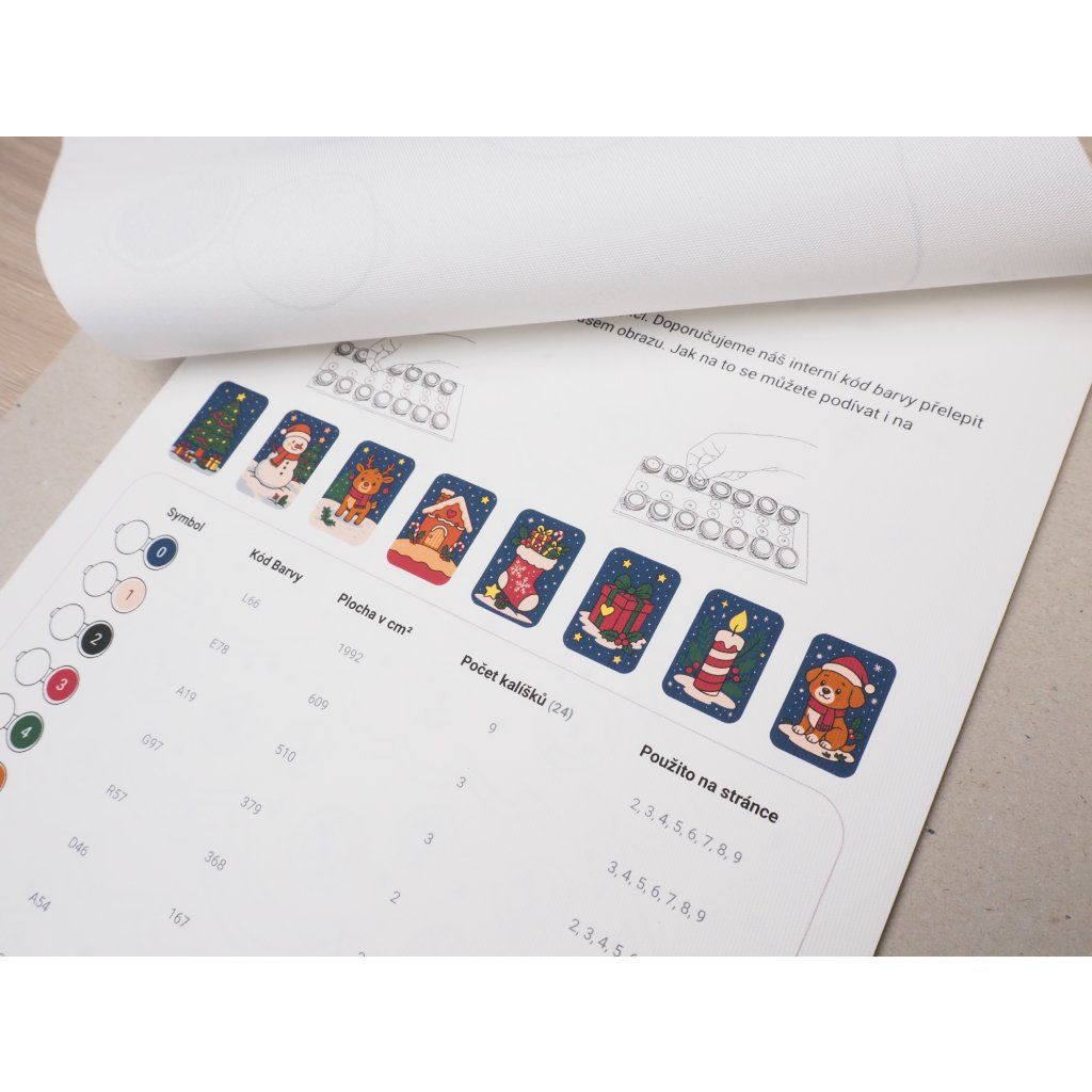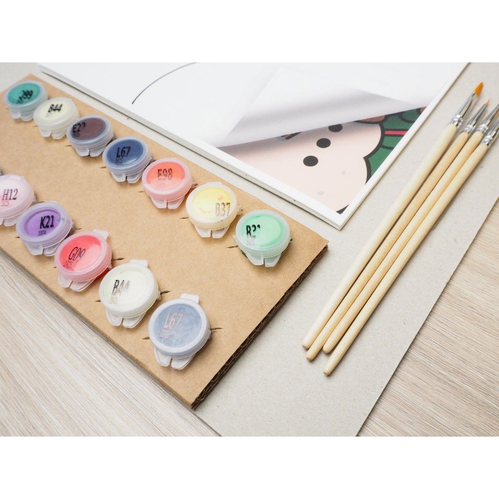 Contiene 8 motivi a tema, colori acrilici, pennelli, un supporto per colori fissato su una solida base di cartone e una clip che tiene tutto insieme. Basta aprire, prendere il pennello e iniziare a creare!